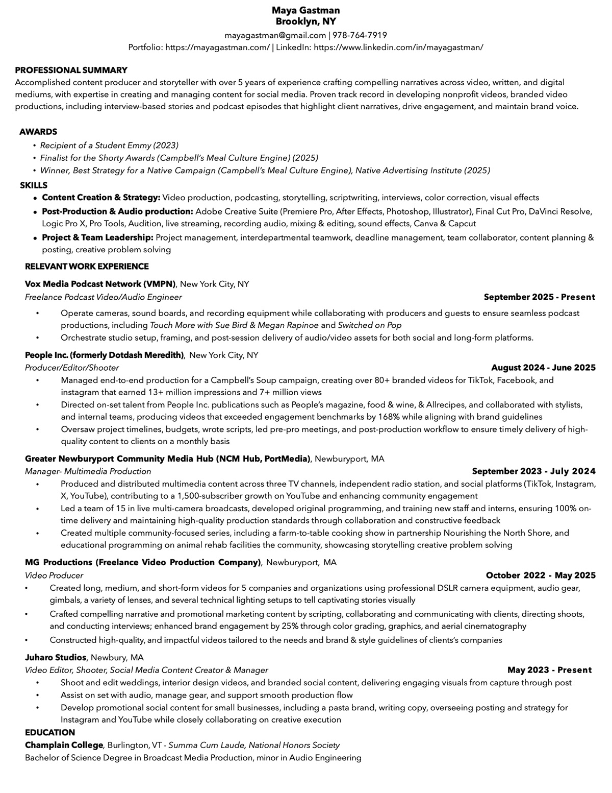 Originally from Newburyport, Massachusetts, I graduated from Champlain College with a Bachelor of Science in Broadcast Media Production and a minor in Audio Engineering. Now based in New York City, my recent experience includes working as a Producer/Editor/Shooter with People Inc. (formerly Dotdash Meredith), where I contributed to branded social campaigns such as Campbell's Soup and Angels Envy. I also currently work with Juharo Studio, where I edit video content and manage social media, writing copy, designing posts, and overseeing accounts. In addition, I freelance with Vox Media Podcast Network as a camera and audio engineer on shows like A Touch More with Sue Bird and Megan Rapinoe and Switched on Pop.